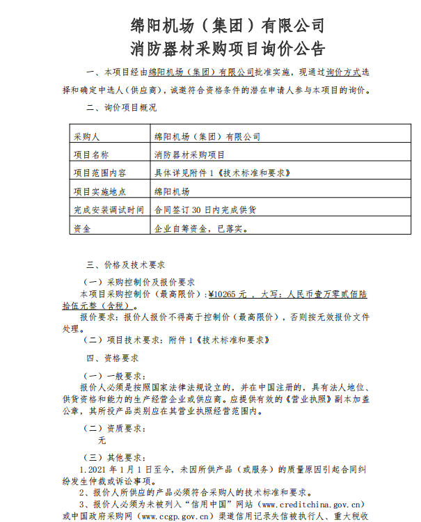 綿陽機(jī)場(chǎng)(集團(tuán))有限公司 消防器材采購項(xiàng)目詢價(jià)公告