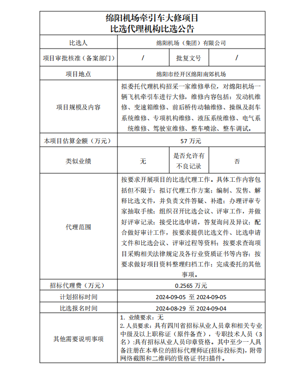 綿陽機場牽引車大修項目比選代理機構(gòu)比選公告