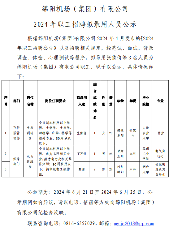 綿陽機(jī)場(chǎng)(集團(tuán))有限公司 2024 年職工招聘擬錄用人員公示